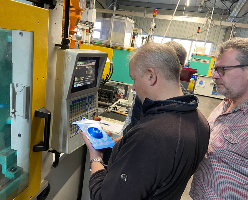 Bemusterung der Automotive Masterplatten bei Grässlin-Partner K-V-V Kaiser-Kunststoff-Verarbeitung in Villingen-Schwenningen (v. li.): Rudolf Reinhart (Produktmanager/Key Account Color Service), Thomas Müller (Geschäftsführer K-K-V Kaiser-Kunststoff-Verarbeitung) und Kuno Weber (Application Development Manager GRÄSSLIN).